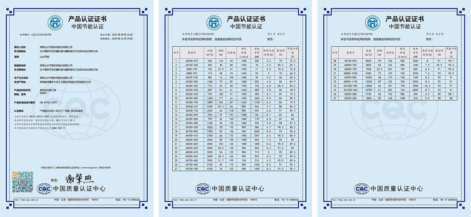 2021年12月,我司AS系列高效节能泵依据CQC31-432212-2009清水离心泵节能认证规则、CQC/F002-2009资源节约产品认证工厂质量保证能力要求,通过GB 19762-2007《清水离心泵能效限定值及节能评价值》的评定,获得中国质量认证中心颁发的《中国节能认证》产品证书。
