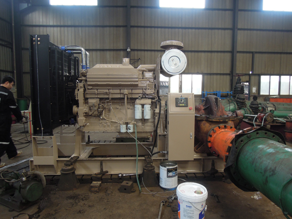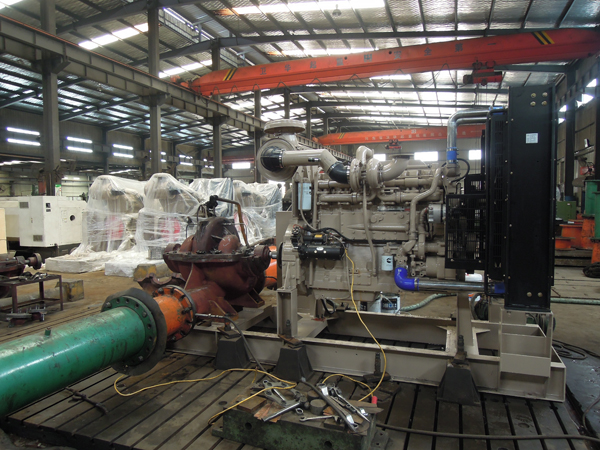 2013年3月我厂与美国客户签订七台XS300-470柴油机单级双吸离心泵,此次签订的XS300-470型号单级双吸离心泵是我厂根据客户需要单独开发的型号。4月12日我厂测试站对整机开始进行测试,随着配套常用功率507KW柴油机的启动,测试站工作人员开始对各项参数进行测试,测试项目包括:性能测试、出水口压力、进水口压力、气蚀余量、震动测试、柴油机噪声测试、轴功率、工频、转速等运行测试。经过两小时的连续运转测试,XS300-470柴油机单级双吸离心泵运行工况正常,各项指标符合设计要求。