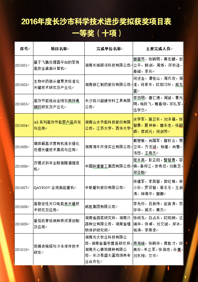 近日,2016年度长沙市科学技术进步奖获奖项目已全部揭晓。拼搏在线平台登录入口携《AS系列高效节能泵产品开发与应用》项目喜获长沙市科学技术进步奖一等奖,是此次水泵行业少有殊荣的企业。