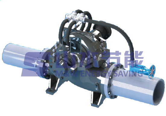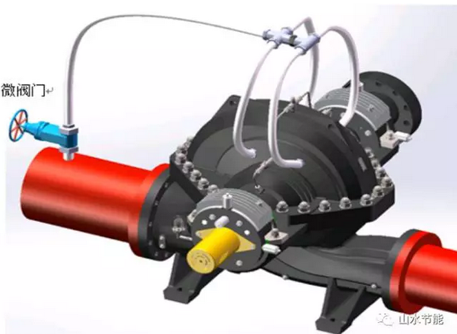 如图所示:当微阀门完全打开时,泵处于最大流量运行。反之,将微阀门全部关闭时,泵处于最小流量运行。泵的流量随着微阀门的打开而无极变化。微阀门采用电动阀门,我们引入自动控制系统,实现人工自动智能调节。在不同时节、不同天气、昼夜温差等外部环境发生变化时,监测系统末端用水量需求,时时调节叶轮宽度,在满足末端用水需求同时,达到节能目标。