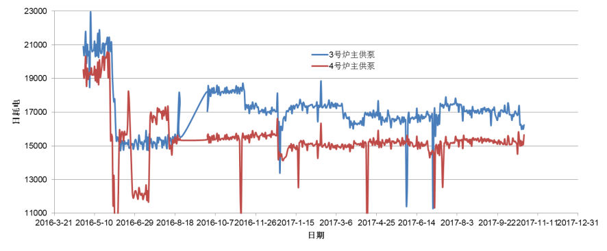 图2 3号炉主供泵和4号炉主共泵耗电每日走势图(对比)