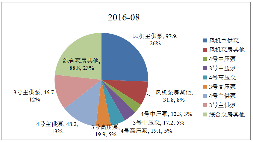 2016年8月和2017年9月的耗电饼图分别见图5和图6所示,饼图中给出了每一个泵站的当月耗电值以及其占总耗电的比例,可以观察分析耗电占比的变化趋势,帮助寻找项目收益变化的主要因素。