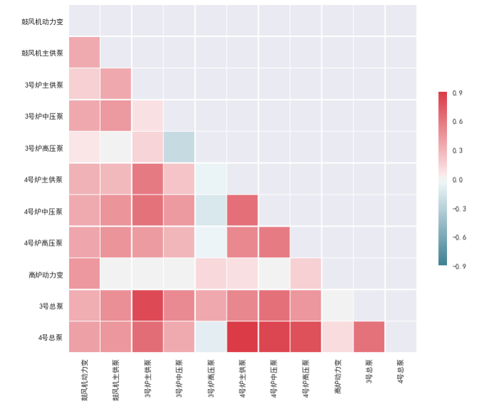 每日电耗相关性分析,主要用于分析具有相互关系的两个泵站(通常属于同一个管网,如同一高炉对应的主供泵与中/高压泵)电耗的相关性,从而交叉对比以了解各泵之间电耗的相互关系,如图7所示。