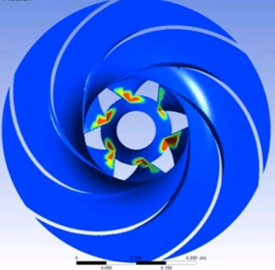 针对某泵型进行汽蚀模拟计算,得到如下图的叶轮壁面空泡分布图。
