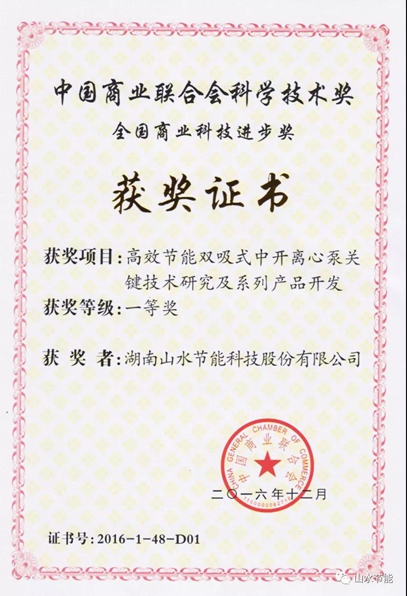 经机械工业排灌机械产品质量检测中心检测,本项目研究的产品效率高,高效范围宽,性能优于国家标准要求,试验效率高于国家标准的规定值1~12个百分点,效率指标高于国内外同类产品测试,经众多用户使用,实用性强,效果良好。专家鉴定其综合技术指标达到国际先进水平。2018年9月17日,2018年全国商业科技质量大会在北京人民大会堂隆重召开。全国商业科技奖是经国家科技部批准设立的我国商业行业科技创新方面最具权威的综合性奖项,旨在奖励在全国商业行业科学研究、技术与管理创新、成果推广、高新技术产业化中做出突出贡献的组织、个人和科研项目。
