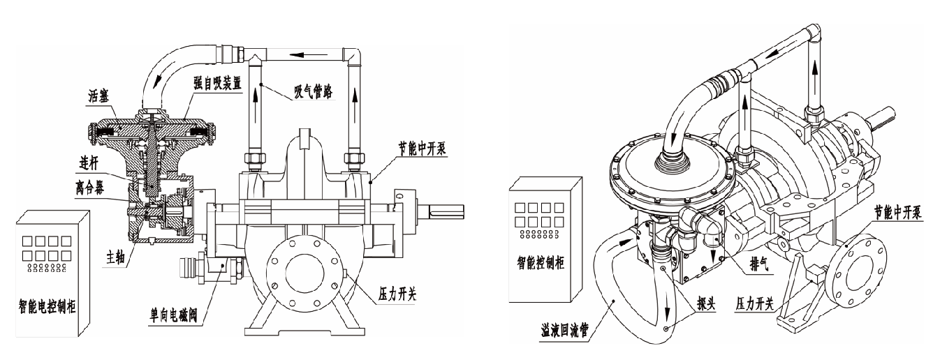 目前,国内外使用的中开式双吸离心泵,工作时需另设真空泵,将泵内空气排尽,或将泵安装在液面以下,靠水倒灌才能启泵工作。设置真空泵装置占用泵房面积,且抽真空会有介质积留,特别是泵送有毒有污染不洁净介质时,真空泵装置就不能使用;而水倒灌启动需要增加大量土建,两种形式造价都较高。我公司拳头产品ZXS强自吸高效节能中开泵完美的解决了以上问题。