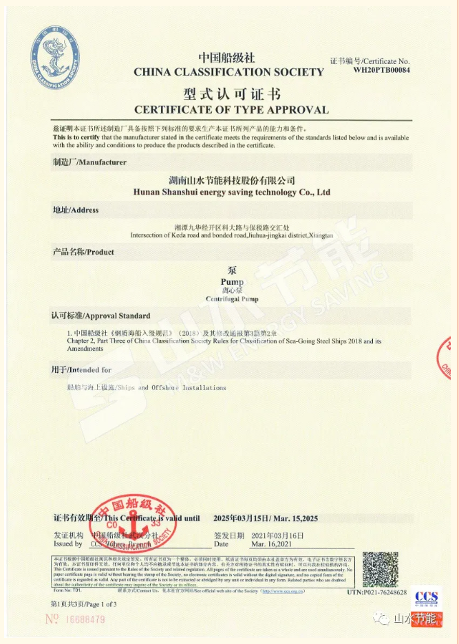 近日,拼搏在线平台登录入口生产的离心泵系列船用泵获得中国船级社颁发的型式认可证书,标志着我司生产的船用离心泵在生产设计、工艺流程、产品质量等方面均达到了国家船舶及海上设施标准要求。型式认可证书的获得为我司拓展船舶行业领域打下坚实的基础,进一步提高企业知名度,提升市场竞争力。