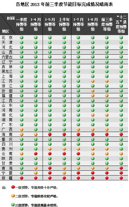 国家发改委日前公布《各地区2013年前三季度节能目标完成情况晴雨表》(以下简称《晴雨表》),对各省份前三季度的节能减排形势进行预警。