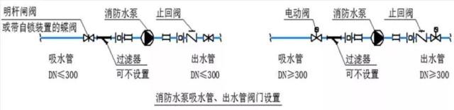 2、消防水泵的出水管,上应设止回阀、明杆闸阀;当采用蝶阀时,应带有自锁装置;当管径大于DN300时,宜设置电动阀门;