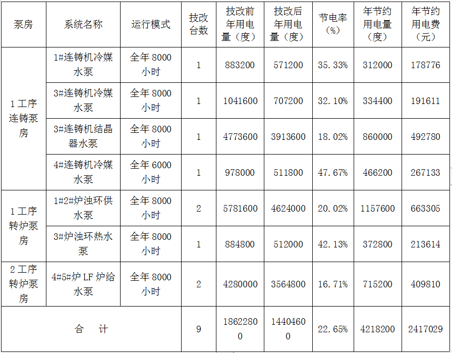 2.1项目目标:按照贵司提供的运行模式,结合本节能技改方案,此节能技改项目平均节电率约为 22.6 %,年节电量约为4218200度,按照电价0.573元/度,预计平均每年可节约电费2417029元。