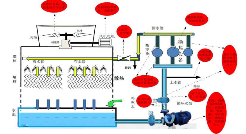 冷却塔风机系统问题:实行工频控制,未对风机系统进行有效调节。